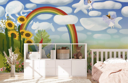 Fröhliche Regenbogenwolken Kinderzimmer Wandmalerei