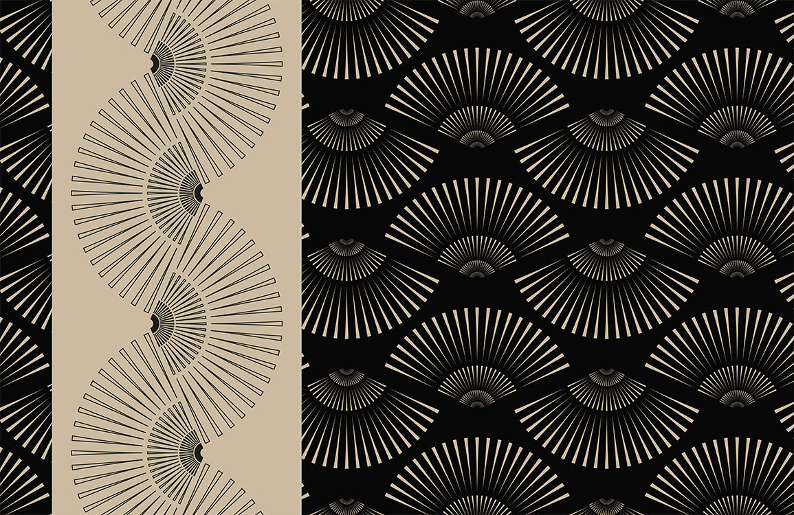 Umarmen Sie die zeitlose Schönheit der Art Deco-Ära mit diesem anspruchsvollen geometrischen Fächer-Wandpapier. Sein elegantes Design und der auffällige Kontrast von beigefarbenen und schwarzen Farbtönen verleihen jedem Raum ein luxuriöses Ambiente.