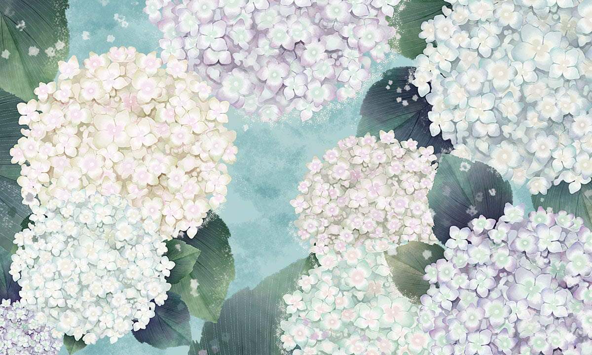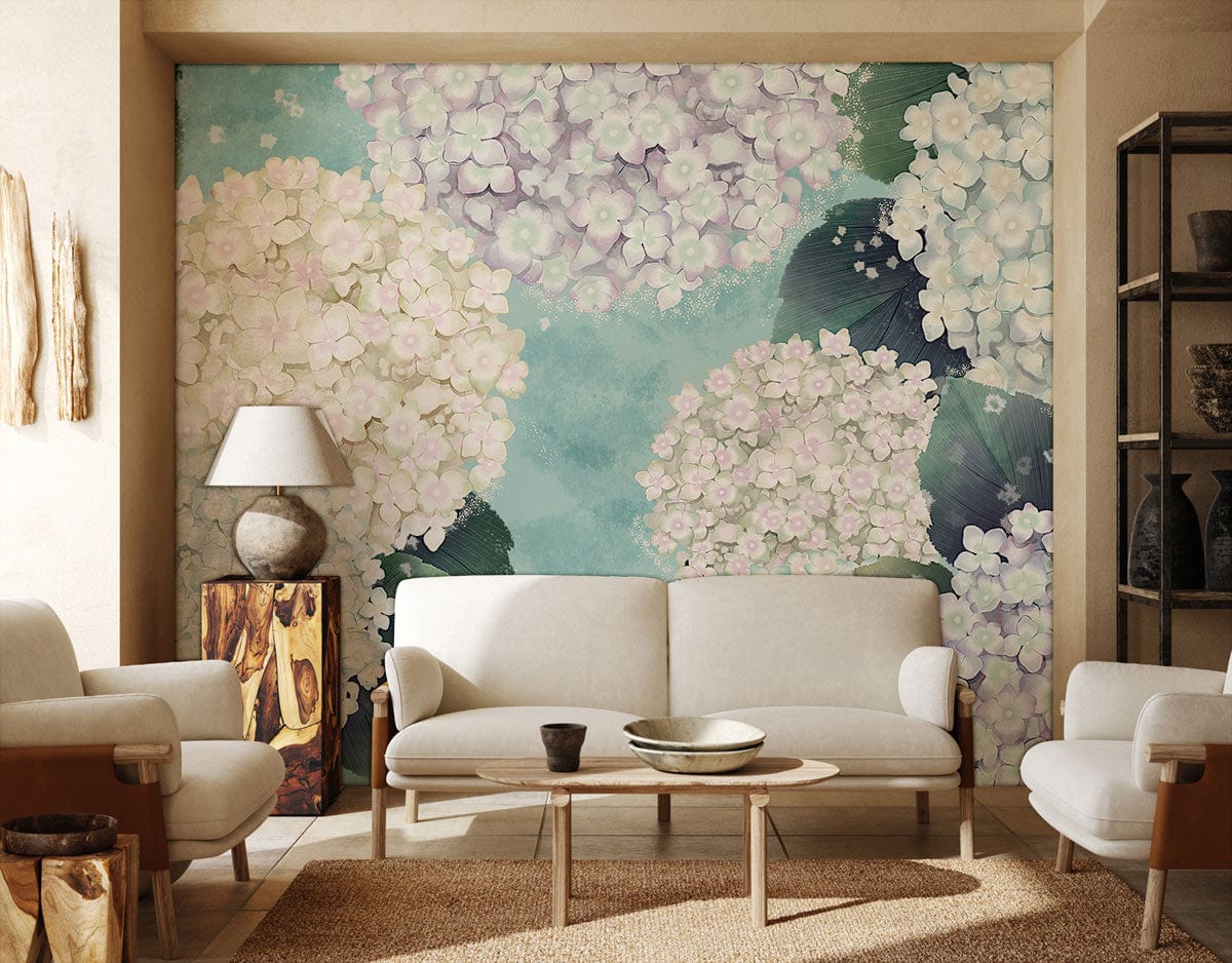 Erhöhen Sie Ihren Raum mit diesem sanften Pastell-Hortensienblüten-Floraltapete, das zarte Cluster von Hortensienblüten in sanften Pastellfarben zeigt. Perfekt für die Schaffung einer ruhigen und romantischen Atmosphäre in jedem Raum.
