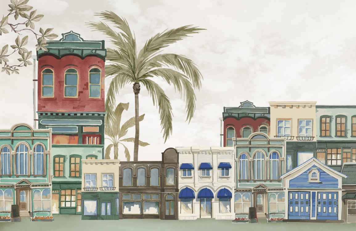Verwandeln Sie jeden Raum mit diesem bezaubernden Vintage Townscape Wallpaper, das eine charmante Illustration von klassischen Gebäuden und Palm Trees zeigt. Die zarte Farbpalette verleiht einen Hauch von Raffinesse, perfekt für die Schaffung eines ruhigen Hintergrunds in Wohnzimmern, Fluren oder Essbereichen.