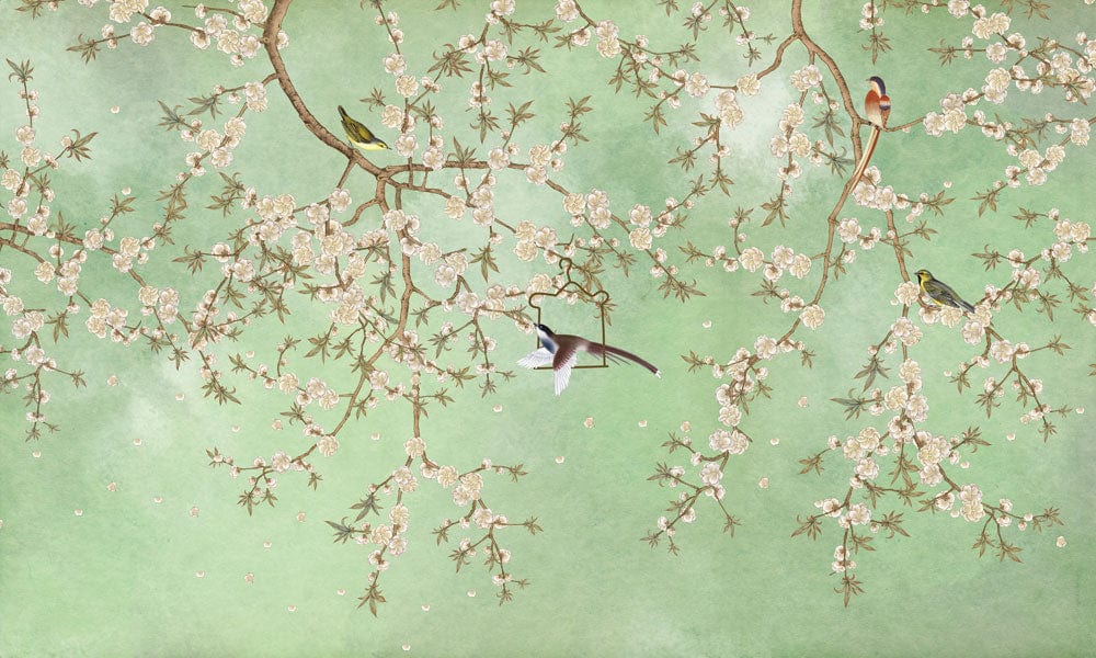 Tauchen Sie ein in einen ruhigen orientalischen Garten mit unserem Elegant Chinoiserie Bird Floral Wallpaper. Perfekt um einen exquisiten Hintergrund in Ihrem Wohnraum zu schaffen, zeigt dieses Wallpaper zarte Vögel, die auf blühenden Ästen vor einem sanften smaragdgrünen Hintergrund sitzen und einen Hauch von von der Natur inspirierten Raffinesse hinzufügen.