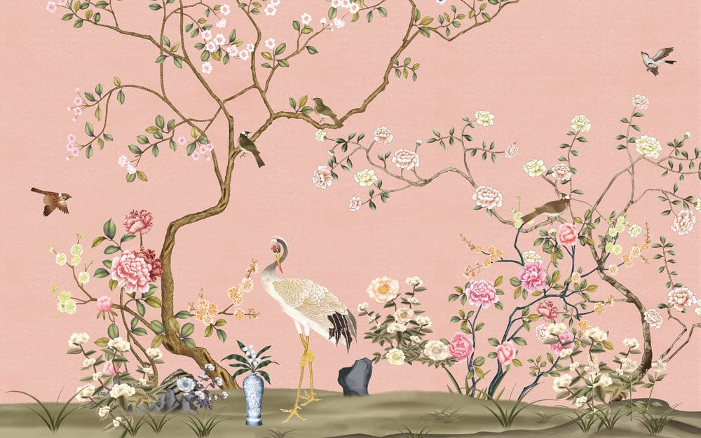Verwandeln Sie Ihren Raum mit unserem Elegant Pink Chinoiserie Floral Wallpaper, das ein zartes Vogel- und Botanikmuster vor einem sanften rosa Hintergrund zeigt. Perfekt, um eine anspruchsvolle und ruhige Atmosphäre in jedem Raum zu schaffen.