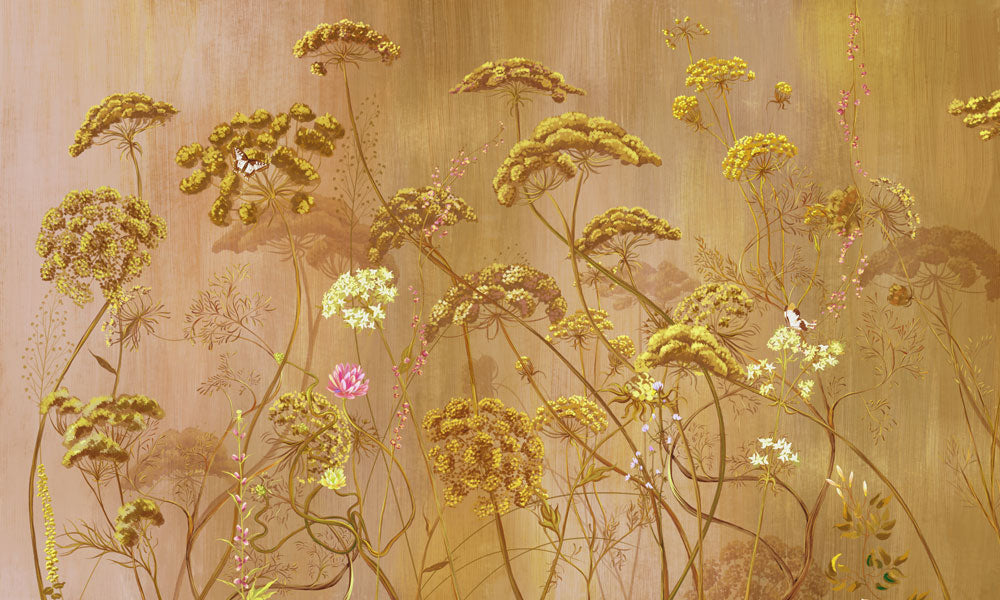 Dieses Tapetendesign zeigt eine ruhige Mischung aus zarten botanischen Elementen, die vor einem sanften, verlaufenden Hintergrund stehen, der von warmen Erdtönen zu kühlen Grüntönen übergeht. Die filigranen Details des Laubs und der Blumen schaffen eine ruhige, fast ätherische Atmosphäre.