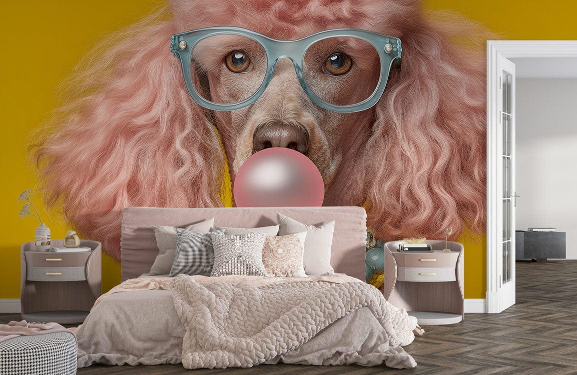 This playful mural stars a pink-curled poodle blowing bubblegum, decked out in chunky jewels and oversized glasses against a bold yellow backdrop. The vivid pop-art colours instantly lift the mood, turning any wall into a quirky statement that sparks smiles, creativity, and conversation every time you walk in.