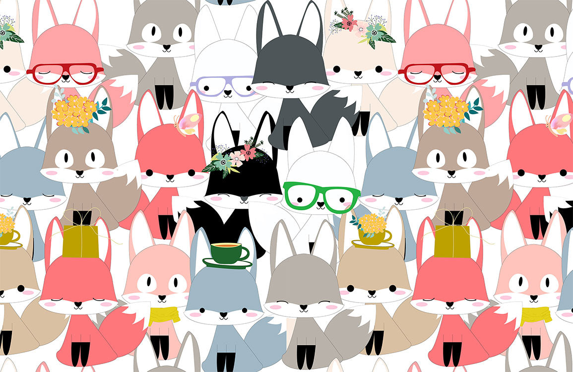 Erhellen Sie jeden Raum mit diesem verspielten, bunten Tiermuster-Tapete, die fantasievolle Füchse in verschiedenen Outfits zeigt. Perfekt für Kinderzimmer oder kreative Räume, fügt es jedem Innendesign einen bezaubernden und unbeschwerten Akzent hinzu.