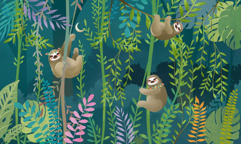 Verwandeln Sie Ihren Raum mit unserem Tropical Sloth Botanical Wallpaper, das verspielte Faultiere inmitten üppigem Grün zeigt. Ideal, um einem Raum eine lebendige, von der Natur inspirierte Note zu verleihen, ist dieses strapazierfähige Wallpaper perfekt, um eine einzigartige und einladende Atmosphäre zu schaffen.