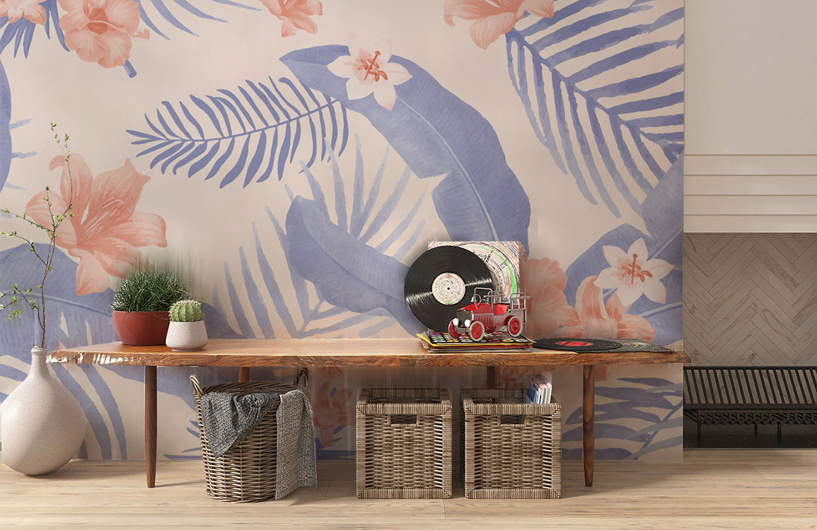 Verleihen Sie Ihrem Raum mit unserem Tropical Floral Blue Pink Wallpaper einen Hauch von Eleganz. Dieses üppige Design zeigt lebhafte pinkfarbene Blumen und reichhaltiges blaues Laub vor einem subtilen Hintergrund, ideal um eine friedliche und exotische Atmosphäre zu schaffen.