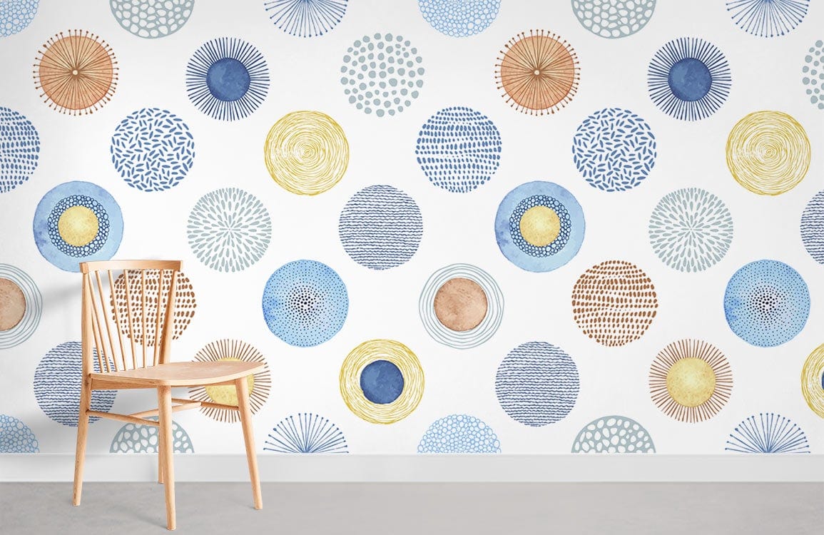 Erhöhen Sie Ihren Raum mit unserem einzigartigen kreisförmigen geometrischen Wallpaper von Ever Wallpaper, das eine harmonische Mischung aus Blau, Gelb und neutralen Tönen bietet. Diese eindrucksvollen Formen schaffen eine moderne und verspielte Ästhetik, die perfekt geeignet ist, um jedem Raum Tiefe und Interesse zu verleihen.