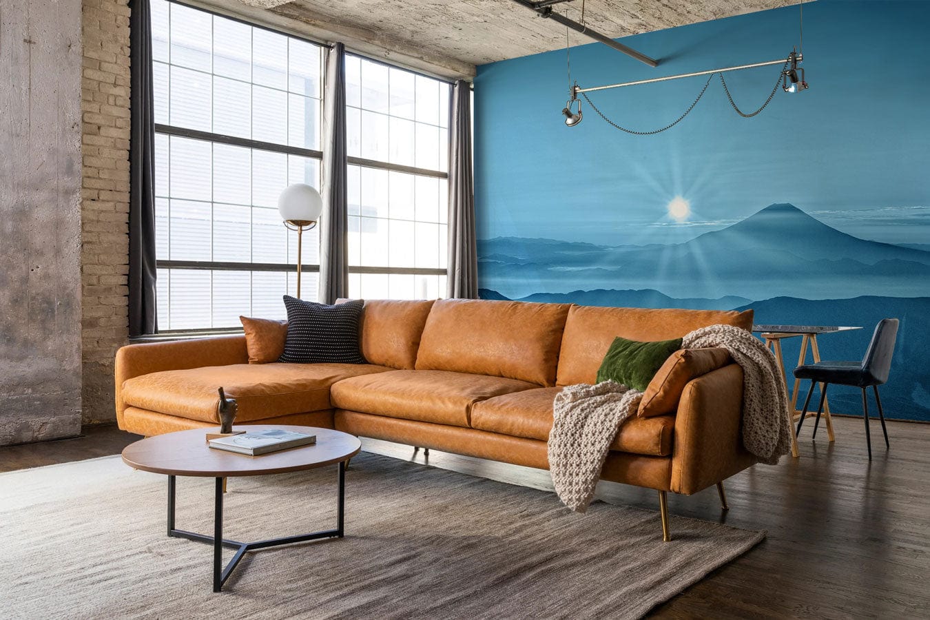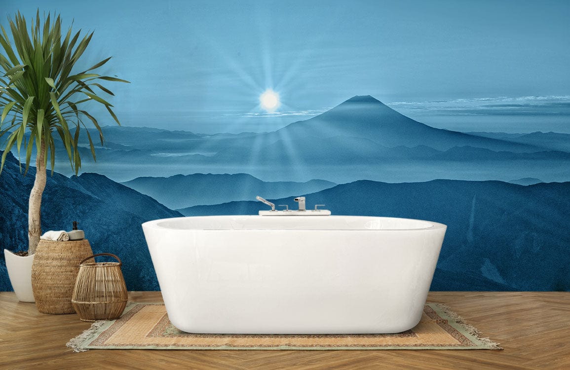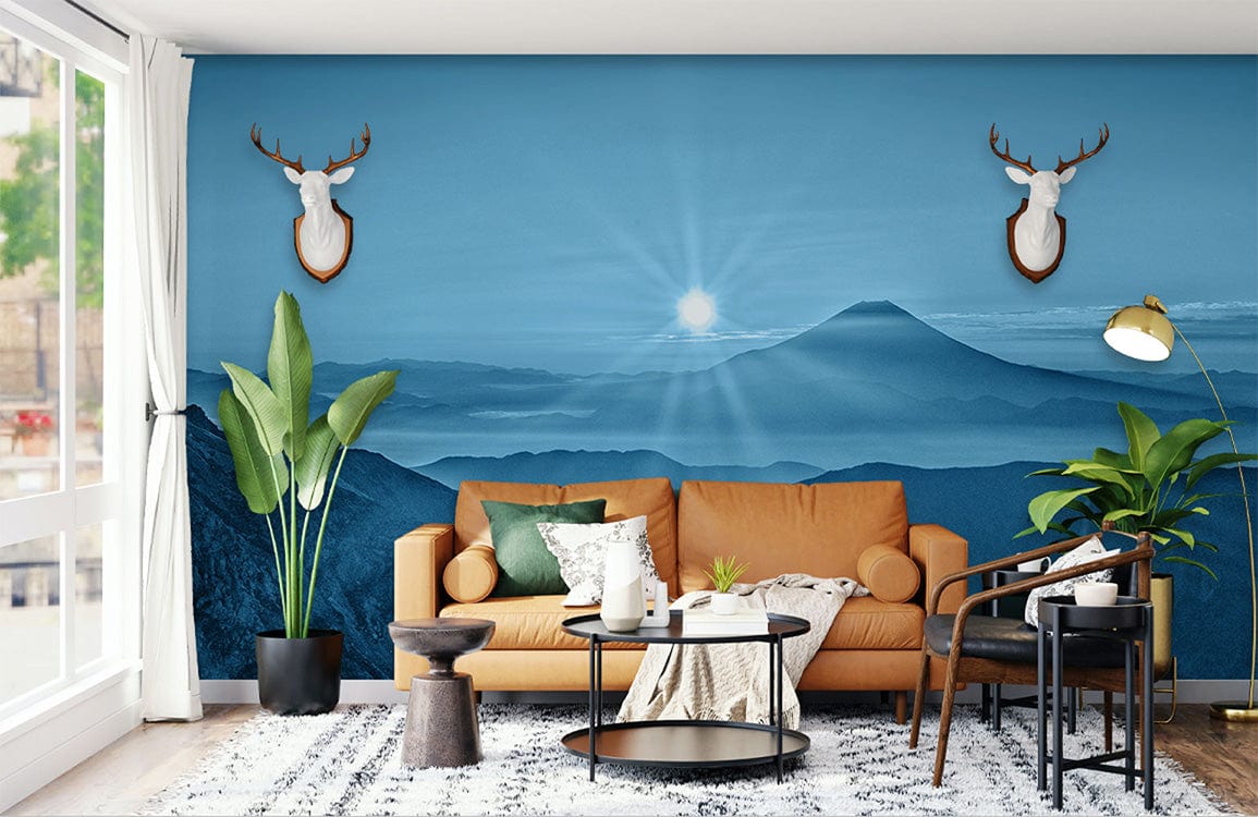 Erhöhen Sie Ihren Raum mit unserem ruhigen Bergmorgen-Wallpaper. Fangen Sie das Wesen eines friedlichen Morgens über nebligen Gipfeln ein. Perfekt für die Schaffung eines ruhigen Rückzugsortes in jedem Raum, mit kühlen Blautönen und einem Hauch von Natur.
