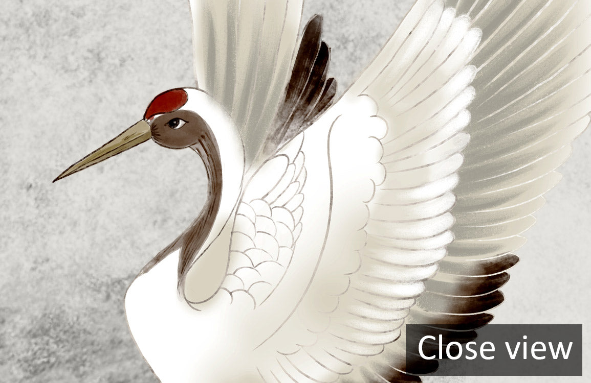 Geschmücke deine Wände mit dieser wunderbar eleganten Vintage-Tapete, die elegante Kranich-Illustrationen vor einem strukturierten grauen Hintergrund zeigt. Perfekt, um ein Gefühl von Ruhe und zeitlosem Stil in jeden Innenraum zu bringen.