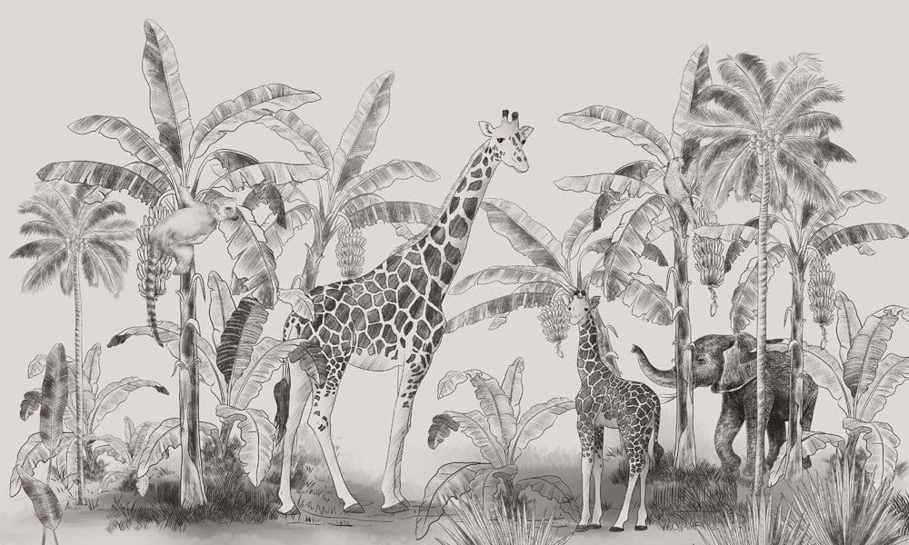 Umfassen Sie die wildere Seite mit unserem Safari Jungle Black and White Wallpaper, perfekt für einen exotischen Akzent in jedem Raum. Fesselnde Giraffenskizzen zwischen üppigen Palmen-Silhouetten schaffen eine ruhige, elegante Atmosphäre. Ideal für Akzentwände oder ein Kinderzimmer.