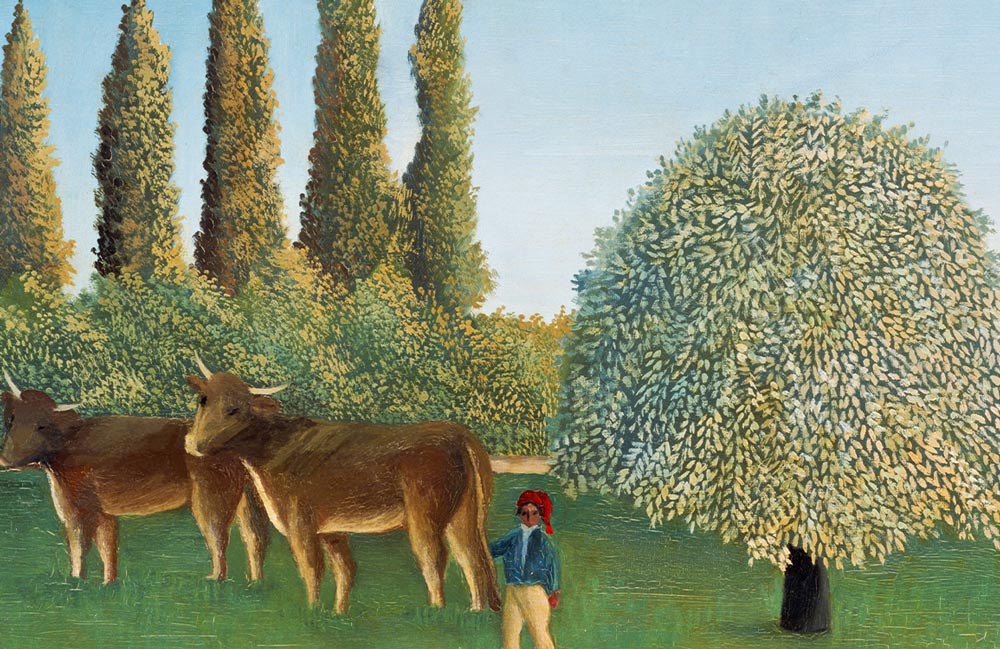 Verwandeln Sie jeden Raum mit unserem Rustic Pastoral Landscape Art Wallpaper, das eine ruhige Farmszene mit Nutzvieh und üppigem Grün zeigt. Ideal, um eine friedliche Atmosphäre in Ihrem Wohnraum zu schaffen.