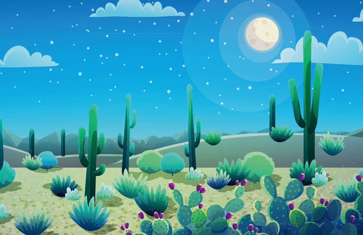 Verwandeln Sie jeden Raum mit unserem Desert Night Cactus Landscape Wallpaper. Ideal, um eine ruhige und exotische Atmosphäre zu schaffen, zeigt diese Tapete eine lebhafte Illustration einer mondbeschienenen Wüstenlandschaft, belebt mit verschiedenen Kakteen und ruhigen Farben.
