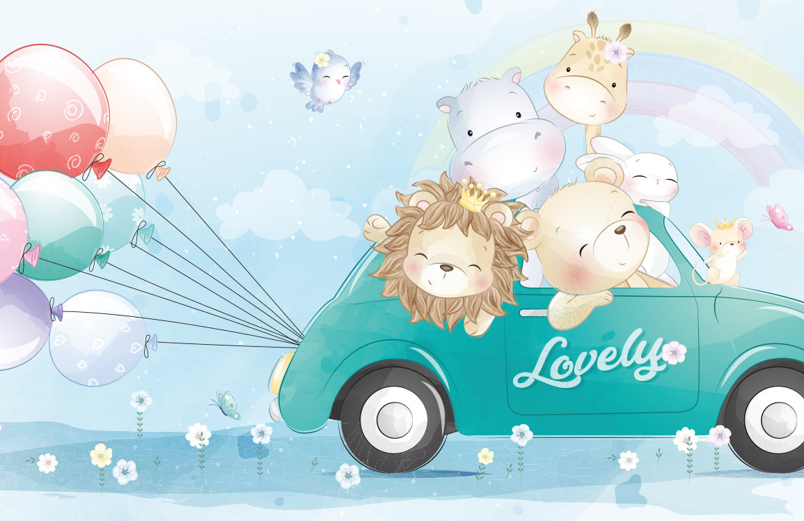 Bringen Sie einen Hauch von Verspieltheit und Freude in den Raum Ihres Kindes mit dieser charmanten Tapete, die eine verspielte Illustration von süßen Tieren in einem Auto zeigt, das von Ballons getragen wird. Ihre sanfte Pastellpalette schafft eine ruhige und einfallsreiche Kulisse, die perfekt für Kinderzimmer und Spielzimmer ist.