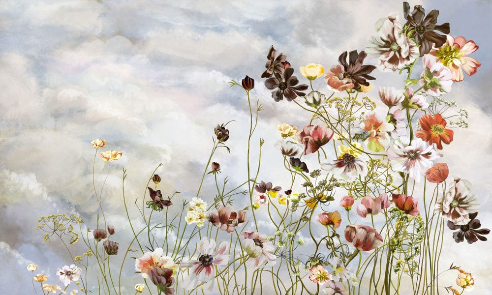 Verwandeln Sie Ihren Raum mit unserem Elegant Botanical Garden Floral Wallpaper, das eine wunderschöne Mischung aus sanften Wildblumen vor einem himmelinspirierten Hintergrund zeigt. Perfekt, um einen Hauch von natürlicher Ruhe in jeden Raum zu bringen.
