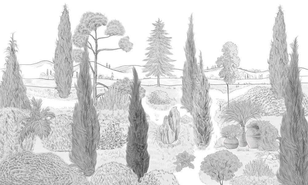 Verwandeln Sie Ihren Raum mit unserem Monochrome Scenic Botanical Forest Wallpaper. Dieses hochwertige Design umfasst komplizierte Skizzen von üppigen Wäldern und detaillierten botanischen Elementen, die perfekt sind, um Eleganz und Ruhe in jeden Raum zu bringen.