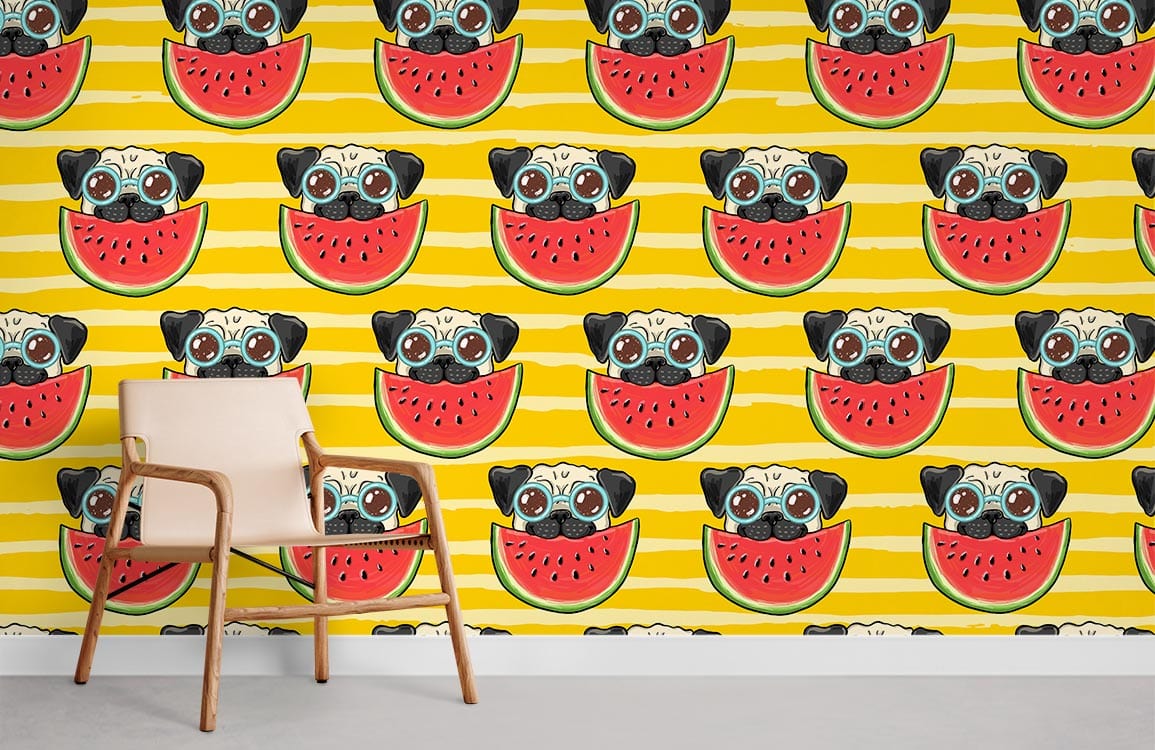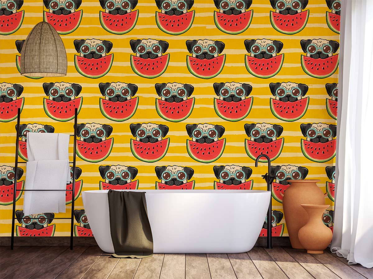 Bringen Sie Farbe in jeden Raum mit diesem Playful Pug Watermelon Stripe Wallpaper, das niedliche Pugs zeigt, die saftige Wassermelonen vor einem lebhaften gelben Streifen-Hintergrund genießen. Perfekt, um Ihrem Raum eine lustige, verspielte Note zu verleihen.