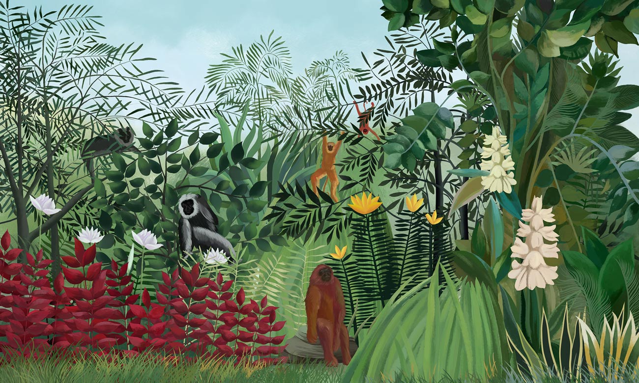 Bringen Sie die Natur mit unserem üppigen Tropical Jungle Animal Print Wallpaper nach drinnen, das lebendige Grün und exotische Fauna zeigt. Perfekt, um einen bezaubernden Rückzugsort in Ihrem Zuhause zu schaffen, wird dieses Wallpaper jeden Raum in eine ruhige Dschungeloase verwandeln.
