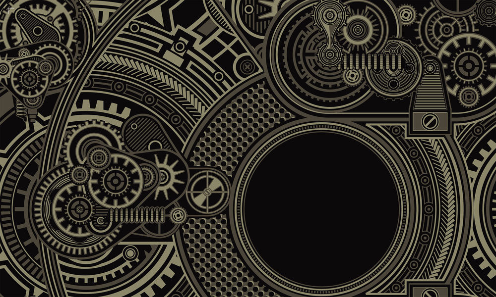 Verwandeln Sie Ihren Raum mit dieser eleganten schwarzen Tapete, die über komplexe geometrische Muster und ein Steampunk-Flair verfügt. Das Design fördert eine moderne, künstlerische Atmosphäre, die perfekt für ein Büro oder Wohnzimmer ist und sowohl Stil als auch Gesprächsstoff bietet.