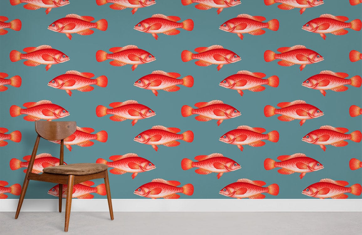 Tauchen Sie Ihren Raum in die Unterwasser-Magie mit unserem lebhaften Red Fish Patterned Wallpaper ein. Perfekt für Wasserliebhaber, bringt dieses Tapezierung einen verspielten Hauch vom Glanz des Ozeans in jeden Raum, mit wunderschön detaillierten Illustrationen roter Fische auf einem ruhigen teal Hintergrund.