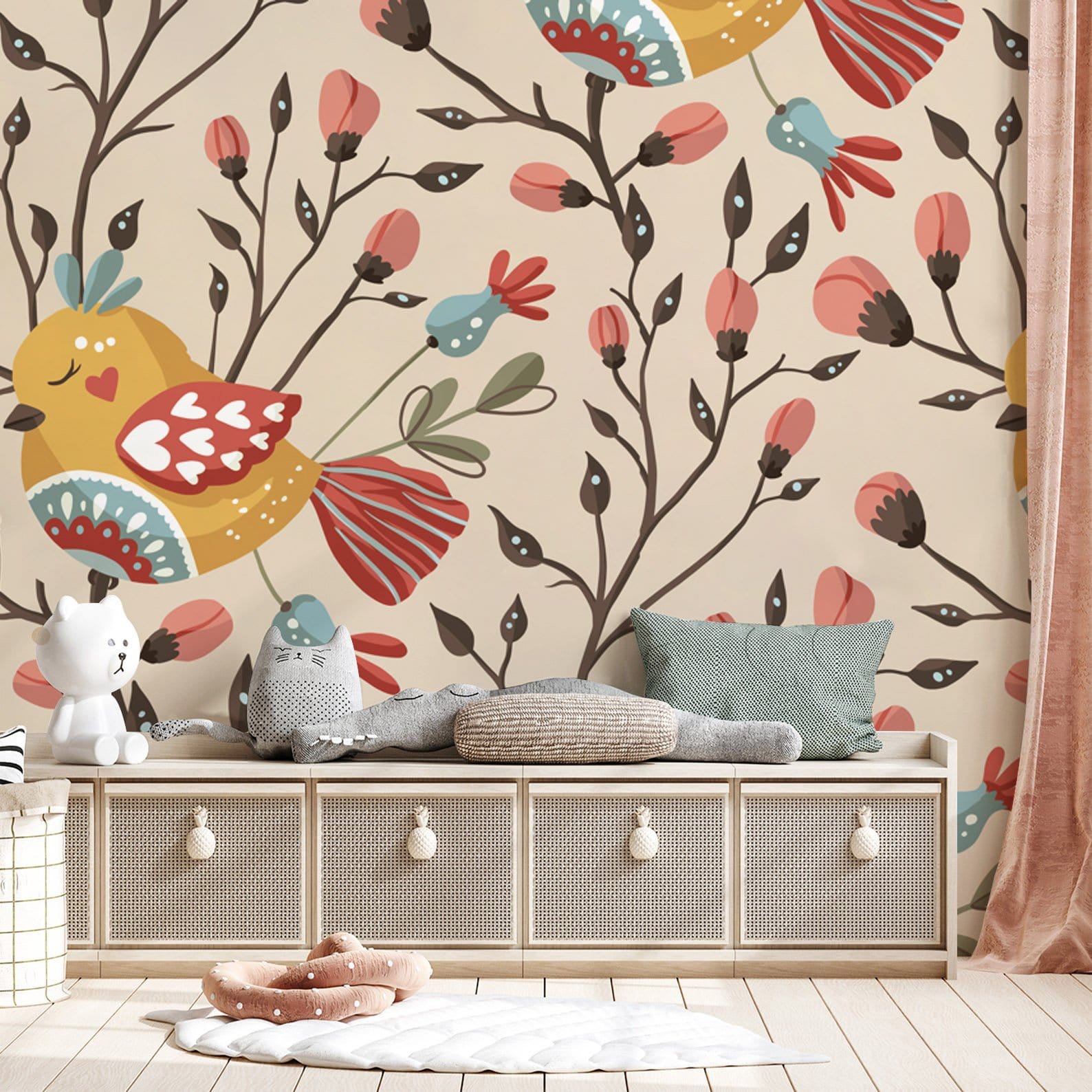 Schaffen Sie eine charmante Atmosphäre mit diesem Whimsical Bird Floral Nursery Wallpaper. Perfekt, um eine natürliche Verspieltheit hinzuzufügen, bringt das entzückende Vogel- und Blumen-Design eine fröhliche Stimmung in jedes Kinderzimmer. Einfach anzubringen mit lebendigen, langlebigen Farben.