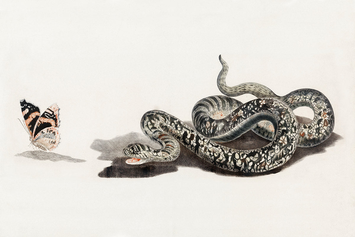 Verleihen Sie Ihrem Raum mit unserem Serpent and Butterfly Wallpaper die Eleganz der Natur. Perfekt für Akzentwände kombiniert dieses Design die beeindruckende Schönheit einer gewickelten Schlange mit dem zarten Charme eines Schmetterlings, vor einem klaren Hintergrund.