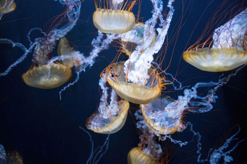 Tauchen Sie ein in das tiefblaue Wasser mit unserem fesselnden Oceanic Jellyfish Dance Wallpaper. Dieses bezaubernde Design zeigt ätherische Quallen, die elegant gleiten und eine ruhige Unterwasseratmosphäre in Ihren Raum bringen. Perfekt, um einen ruhigen Rückzugsort oder eine auffällige Wand zu schaffen.