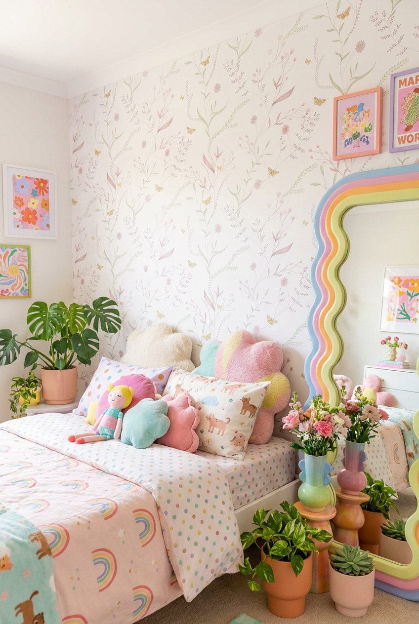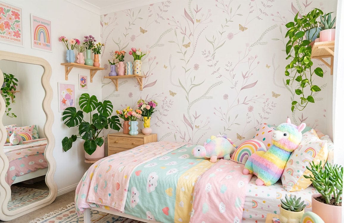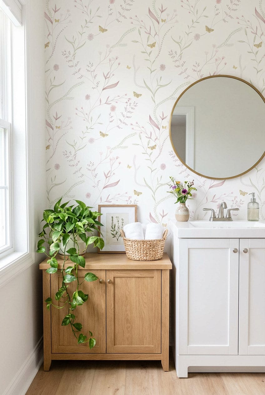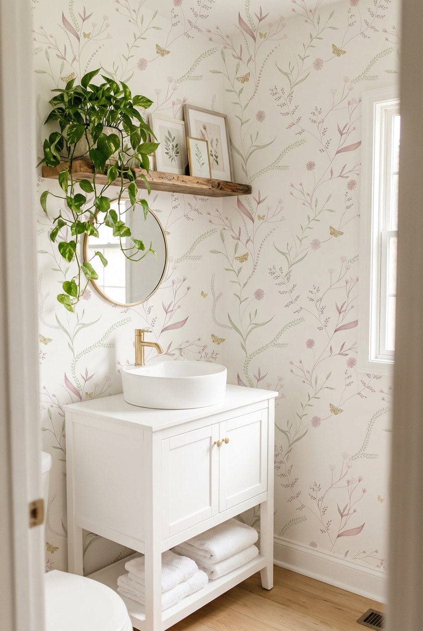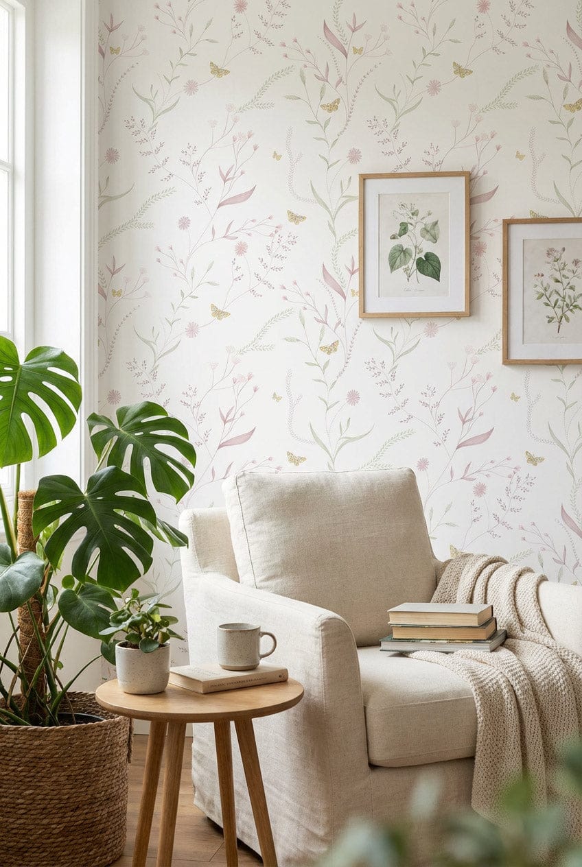 Delicate pastel botanicals drift across a clean white background, accented with gentle leaves and tiny butterflies. The airy composition creates a light, soothing feel, perfect for spaces that call for softness, calm, and understated elegance without visual heaviness.