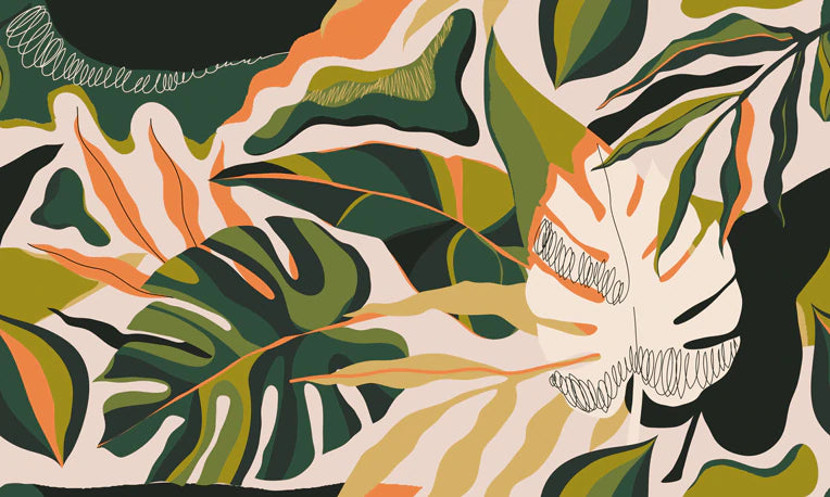Verwandeln Sie Ihren Raum mit unserem lebendigen Tropical Botanical Leaf Pattern Wallpaper, das perfekt ist, um einen Hauch von von der Natur inspirierten Charme hinzuzufügen. Dieses üppige, hochwertige Wallpaper verfügt über eine reiche Palette aus smaragdgrünen, beigen und sanften orangefarbenen Blättern auf einem dunklen Hintergrund, und bietet ein modernes und gleichzeitig zeitloses Design.