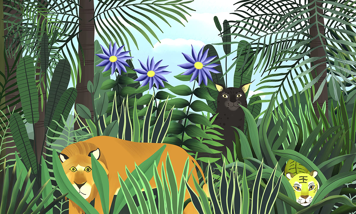 Verwandeln Sie Ihren Raum mit unserem lebhaften Tropical Jungle Animal Print Wallpaper, das einen üppigen grünen Hintergrund mit lebhaften floralen Akzenten und verspielten Tieren bietet. Perfekt, um jedem Raum einen Hauch von exotischer Eleganz zu verleihen.