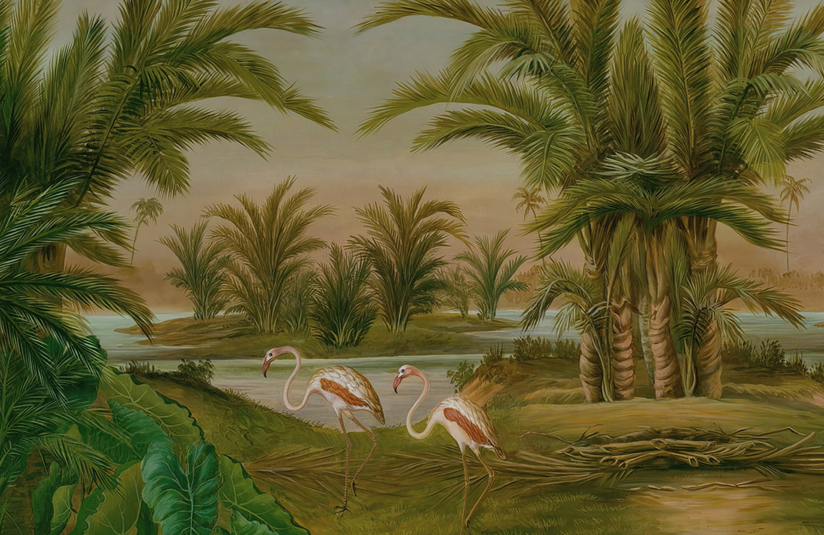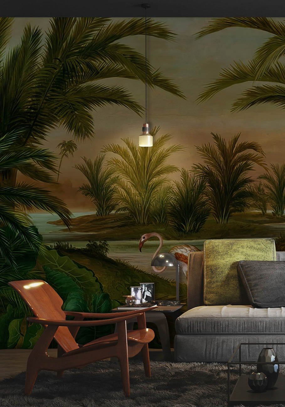 Verwandeln Sie Ihren Raum in ein friedliches, tropisches Refugium mit unserem malerischen Flamingo-Oasen-Wallpaper. Perfekt, um einen Hauch von exotischer Eleganz hinzuzufügen, zeigt es üppige Palmen und anmutige Flamingos inmitten von ruhigen Gewässern. Ideal für Akzentwände in Wohnzimmern oder Schlafzimmern.