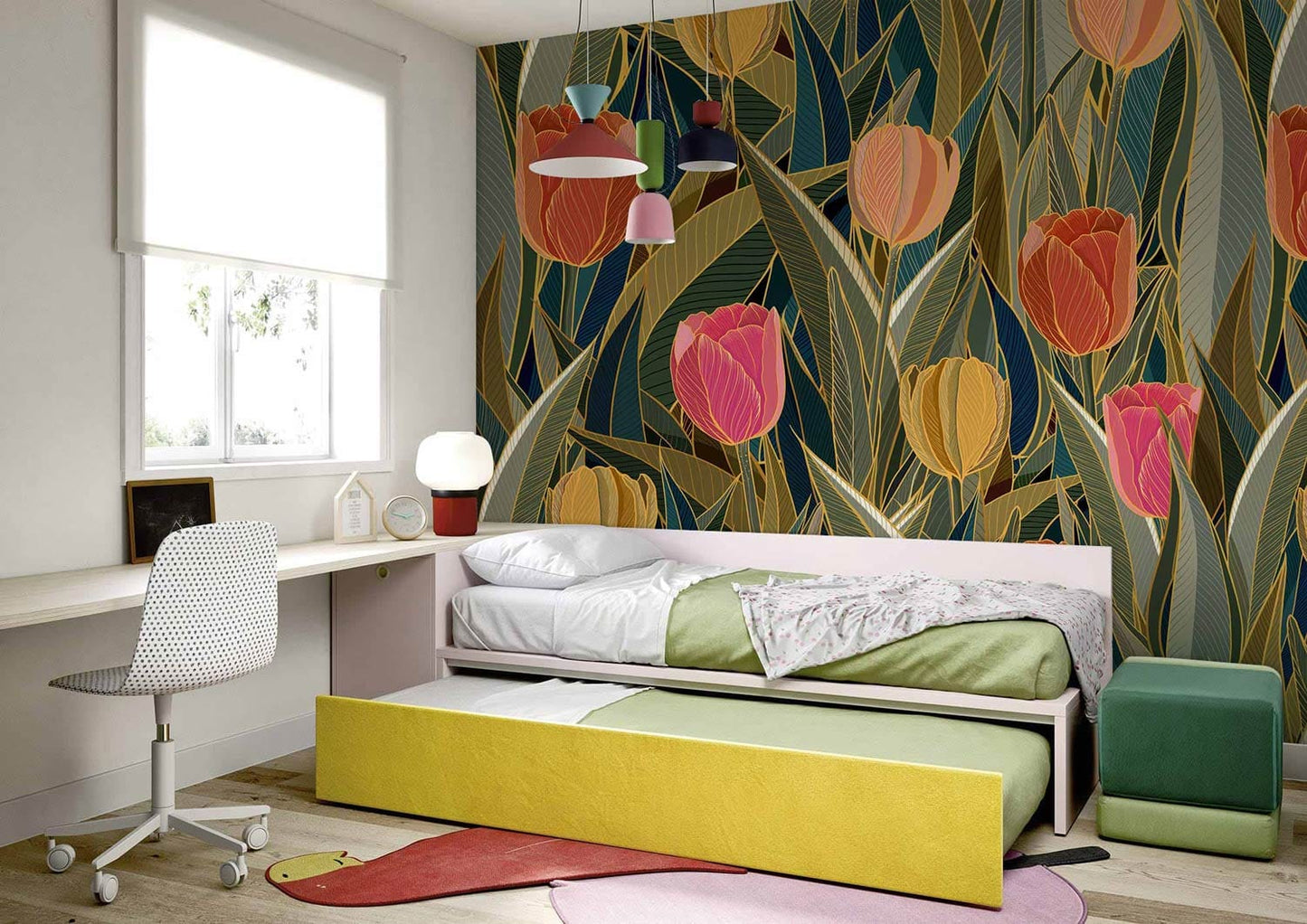 Verleihen Sie Ihrem Raum mit unserem Vintage Floral Tulip Gold Wallpaper eine gehobene Note, das ein zeitlos elegantes Design zeigt. Die perfekte Mischung aus warmen goldenen, pinken und beigen Tulpenmotiven vor einem smaragdgrünen Hintergrund bringt einen eleganten Charme in jeden Raum.