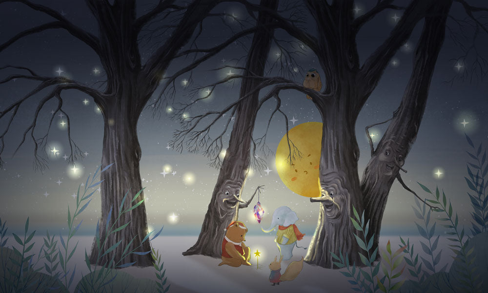 Verwandeln Sie das Zimmer Ihres Kindes in eine magische Welt mit unserem märchenhaften Waldtapete. Mit charmanten Tieren unter einem sternenklaren Himmel schafft es eine fesselnde nächtliche Abenteuer-Szene. Perfekt, um die Vorstellungskraft zu inspirieren.