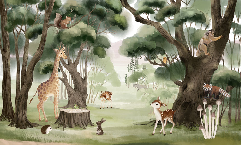 Verwandeln Sie Ihren Raum mit dieser bezaubernden Waldtiere-Tapete. Mit verspielten Illustrationen von Giraffen, Rehen und mehr bringt sie einen Hauch von Natur ins Innere. Perfekt für Kinderzimmer oder verspielte Räume.