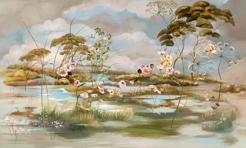Erheben Sie Ihren Raum mit unserer Serene Lakeside Floral Landscape Wallpaper, die eine sanfte Darstellung ruhiger Gewässer und zarter Blumen zeigt. Diese Wandgestaltung ist perfekt, um einen Hauch von Naturruhe in Ihr Zuhause zu bringen und eine einladende sowie entspannende Atmosphäre in jedem Raum zu schaffen.