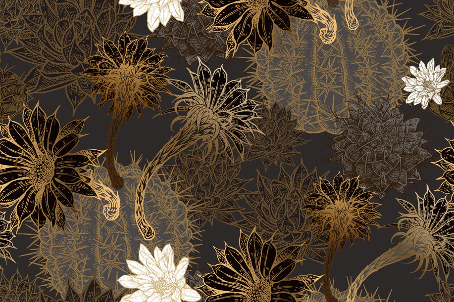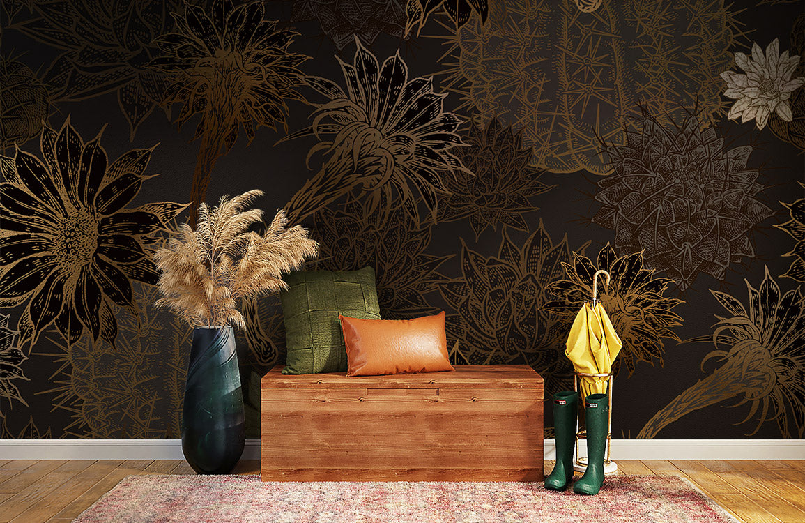 Verleihen Sie Ihrem Raum mit dieser exquisiten goldenen Blumen-Tapete auf einem dunklen Hintergrund Eleganz. Perfekt für die Schaffung einer opulenten und anspruchsvollen Atmosphäre in jedem Raum, verkörpert diese Tapete Luxus und fügt Ihrer Inneneinrichtung zeitlose Eleganz hinzu.