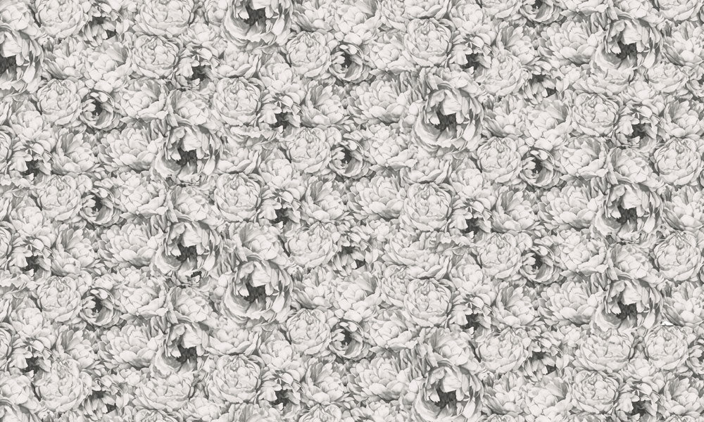 This refined floral wallpaper showcases intricately illustrated peonies in soft grey tones, creating a timeless and elegant all-over pattern. The monochrome palette highlights delicate petal details while maintaining a calm, sophisticated atmosphere, perfect for adding subtle texture and classic charm to interior spaces.