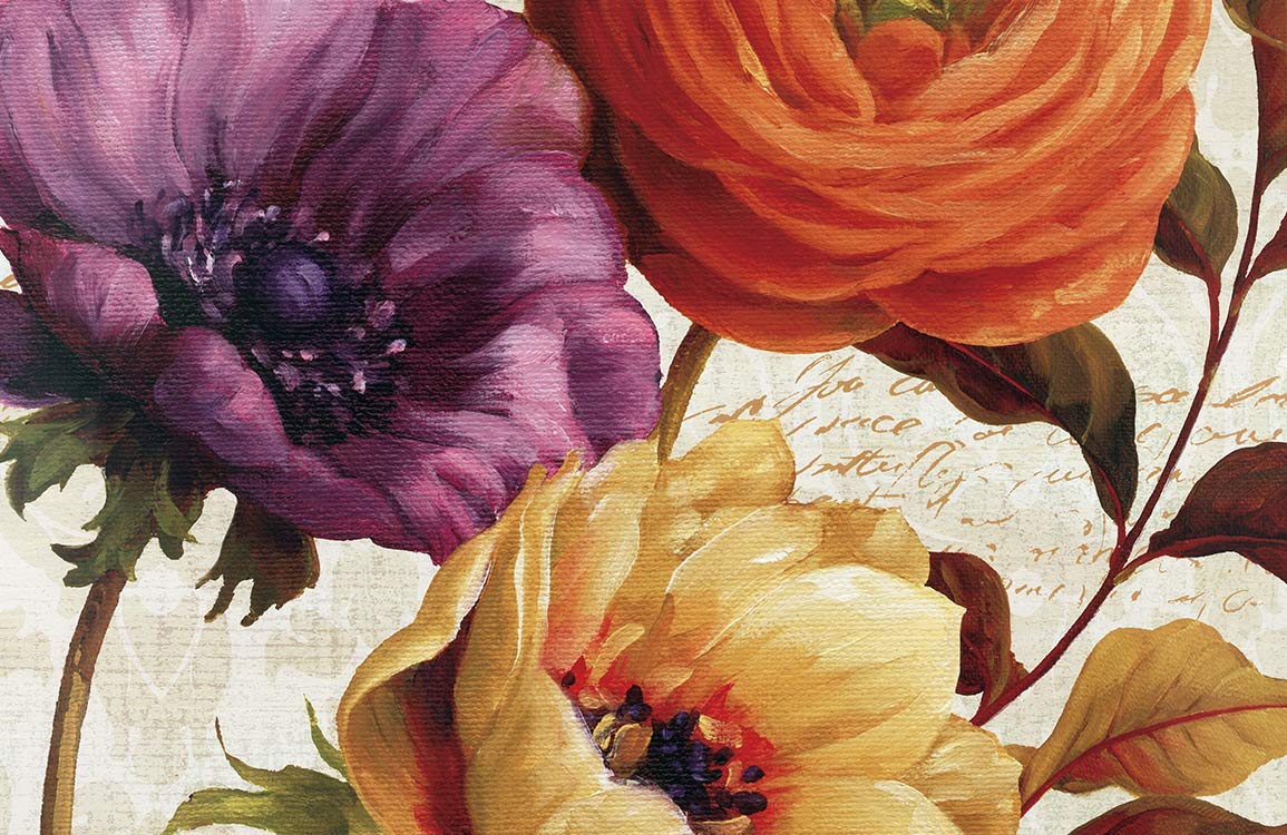 Erheben Sie Ihren Raum mit unserer von Vintage inspirierten botanischen Tapete, die lebendige Blumen vor einem antiken Text hintergrund zeigt. Perfekt, um eine elegante und zeitlose Atmosphäre in jedem Raum zu schaffen.