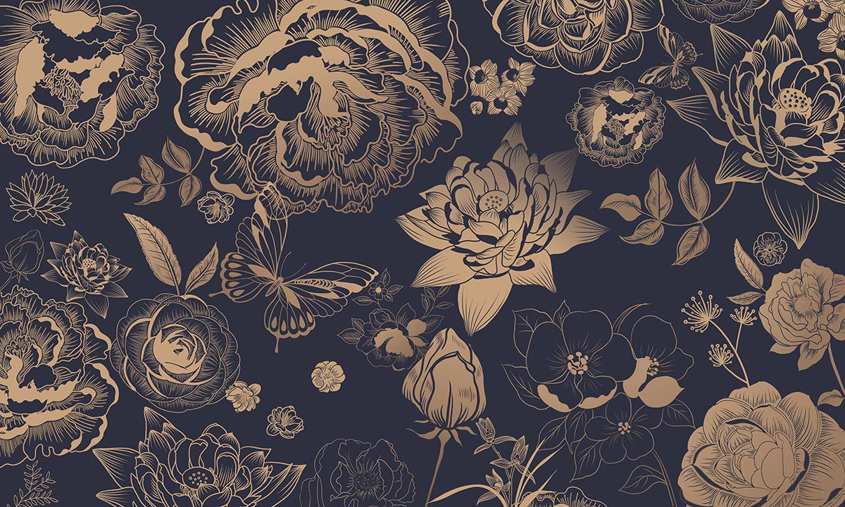 Verwandeln Sie Ihren Raum mit unserem Elegant Gold Floral Navy Wallpaper. Dieses luxuriöse Design präsentiert komplizierte goldene Blumenmuster auf einem tiefen Marinehintergrund, perfekt um jedem Raum einen Hauch von Raffinesse zu verleihen. Ideal für die Schaffung einer opulenten Akzentwand.