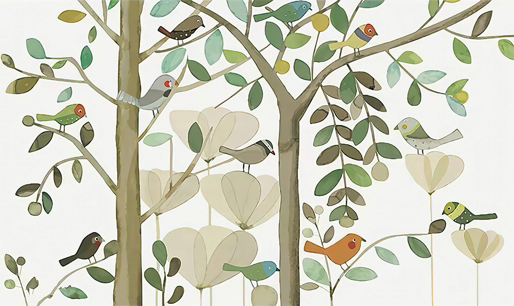 Verwandeln Sie Ihren Raum mit unserem Whimsical Bird Tree Wallpaper, das verspielte Vögel zeigt, die zwischen üppigem Laub sitzen. Perfekt, um jedem Raum eine Note der natürlichen Gelassenheit zu verleihen, bringt dieses strapazierfähige und pflegeleichte Wallpaper eine luftige, botanische Atmosphäre in Ihr Zuhause.