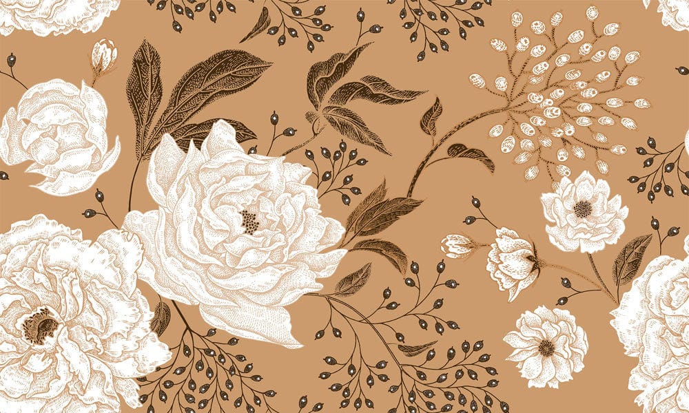 Verwandeln Sie Ihren Raum mit unserem Beige Vintage Floral Elegance Wallpaper, das ein zeitloses Design weißer, filigraner Blumen auf einem warmen beige Hintergrund präsentiert. Diese hochwertige Tapete eignet sich perfekt, um jedem Raum einen Hauch von Raffinesse und Charme zu verleihen.