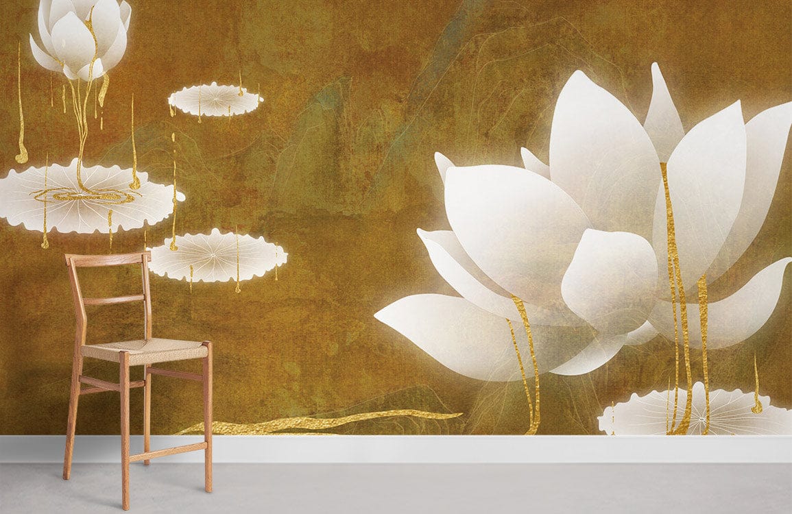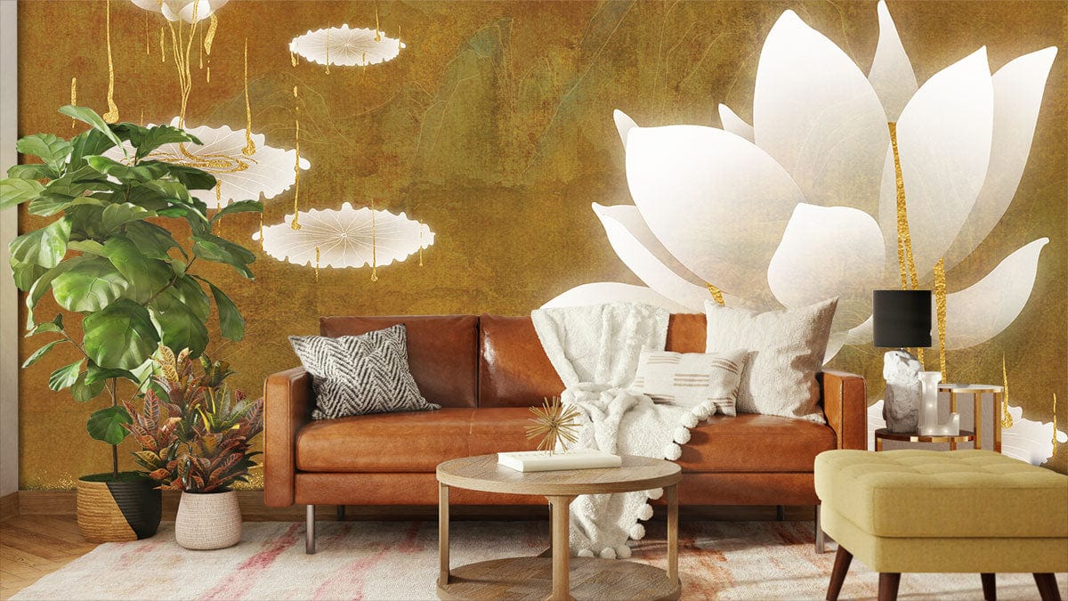 Verwandeln Sie Ihren Raum mit unserem Elegant Gold Floral Botanical Wallpaper, das eine luxuriöse Mischung aus weißen Lotusblüten vor einem reichen goldenen Hintergrund zeigt. Perfekt, um jedem Raum einen Hauch von Raffinesse und Ruhe zu verleihen.
