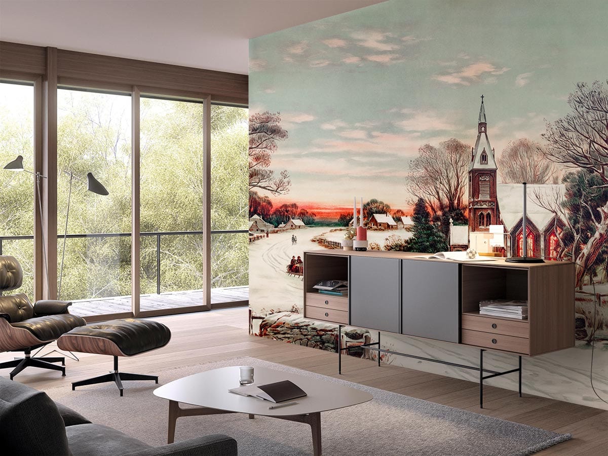 Verwandeln Sie Ihren Raum mit unserem Vintage Winter Landscape Wallpaper, das eine ruhige Dorfszene zeigt, die in Schnee gehüllt ist. Perfekt, um jedem Raum in den kalten Jahreszeiten einen Hauch von Nostalgie und Wärme zu verleihen.