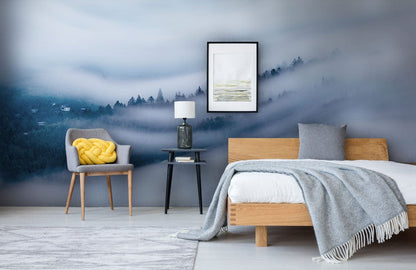 Verwandeln Sie Ihren Raum mit unserem ruhigen Misty Forest Landscape Wall Mural. Ideal zur Schaffung einer friedlichen Atmosphäre, bietet dieses hochwertige Wallpaper ätherischen Nebel zwischen zeitlosen Bäumen in beruhigenden Blau- und Grautönen.