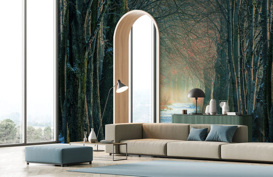Mural de papier peint de scène naturelle de forêt brumeuse