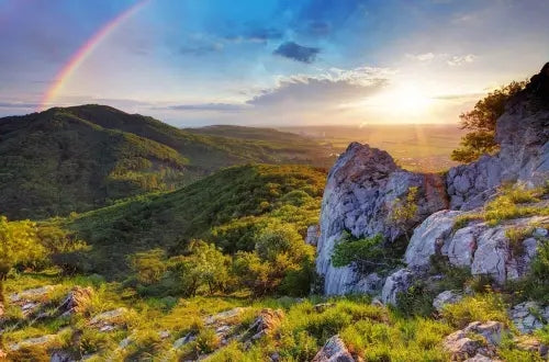 Capturez la tranquillité de la nature avec notre papier peint Sunset Mountain Landscape. Parfait pour apporter une touche de beauté sereine à tout espace, ce papier peint présente une scène de montagne époustouflante baignée dans la lueur chaleureuse d'un soleil couchant, complétée par un arc-en-ciel vibrant.