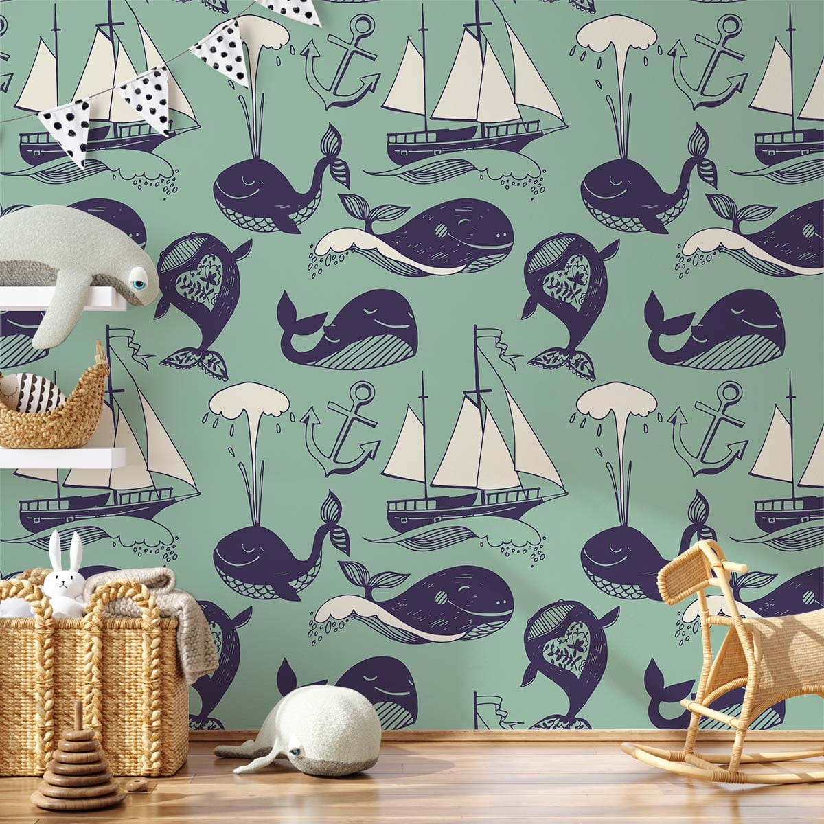 Navigatez avec style avec notre papier peint Nautical Whales and Ships, parfait pour créer une ambiance calme inspirée de l'océan. Le design ludique présente des baleines fantaisistes, des navires élégants et des ancres classiques sur un fond teal serein, en faisant l'option idéale pour une variété d'espaces.