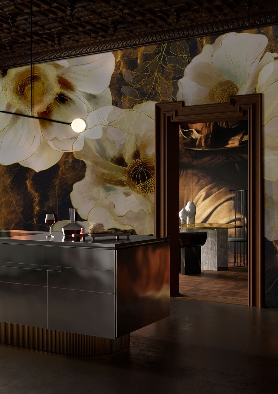 Transformez votre espace avec notre papier peint Gold Floral Elegance Luxe, présentant un design exquis de fleurs douces et épanouies contrastant avec un fond sombre richement veiné. Parfait pour créer une ambiance glamour et sophistiquée dans n'importe quelle pièce.