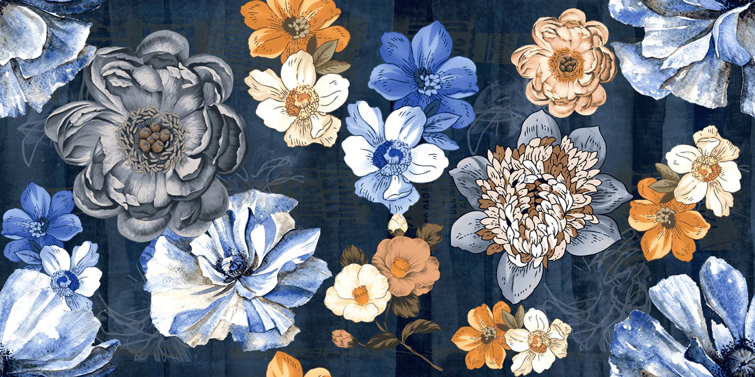 Rehaussez votre maison avec ce luxueux papier peint botanique floral bleu marine, mettant en scène un superbe mélange de fleurs orange et bleues sur un fond sombre et riche. Parfait pour créer un look sophistiqué et intemporel dans n'importe quelle pièce.