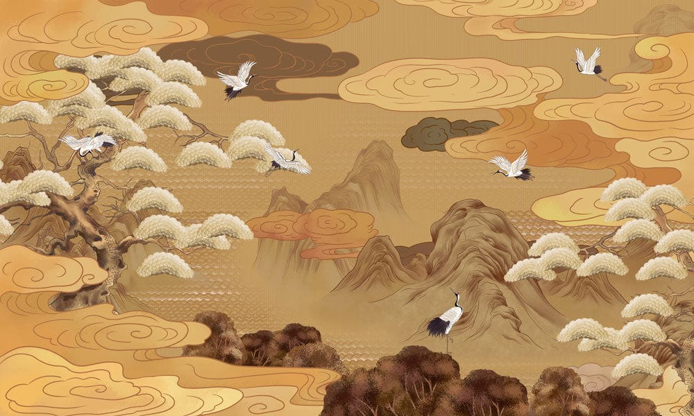 Rehaussez votre espace avec ce papier peint exquis d'inspiration asiatique mettant en scène un paysage serein avec de élégantes grues en vol. Ses tons dorés et son design intemporel apportent une touche luxueuse à n'importe quelle pièce, créant une atmosphère tranquille et raffinée.